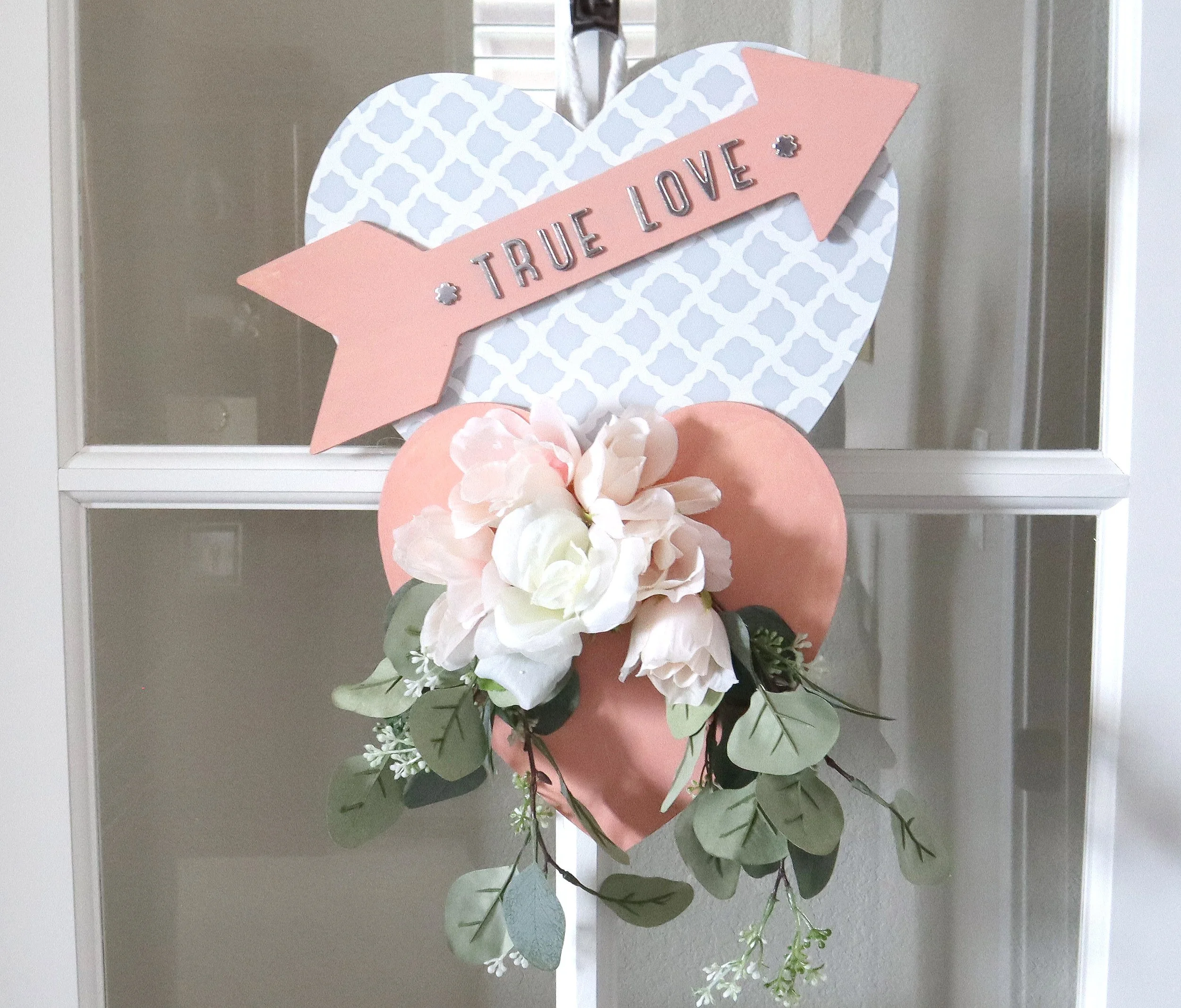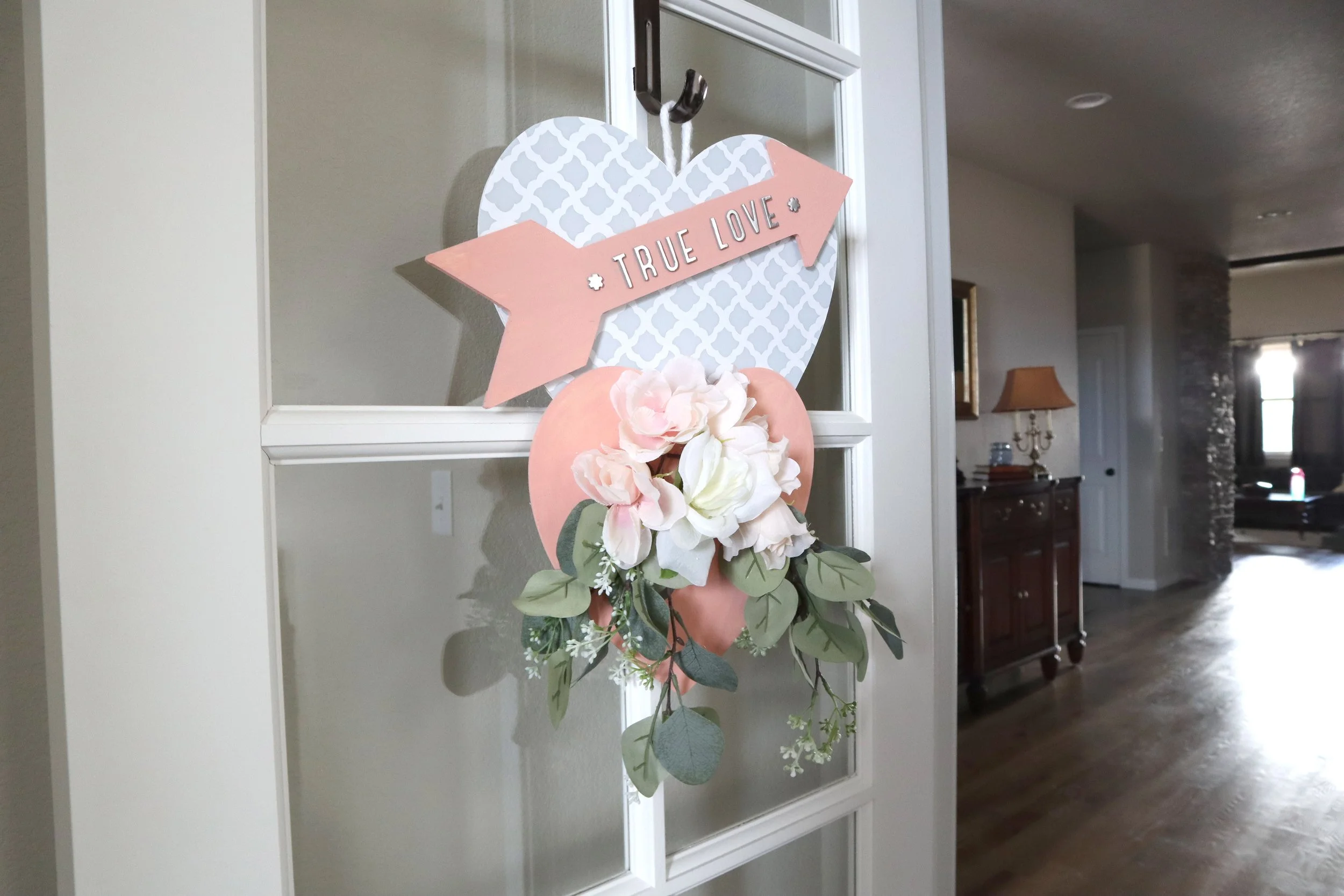 I hung the heart sign on my glass office door with a wreath door hanger and it looks so festive!