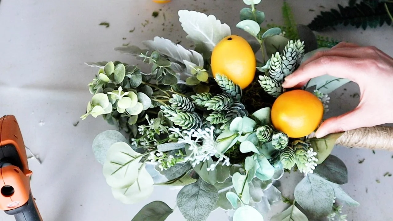 I had these leftover lemons from my recent lemon kitchen makeover. I attached those with hot glue to the foam.